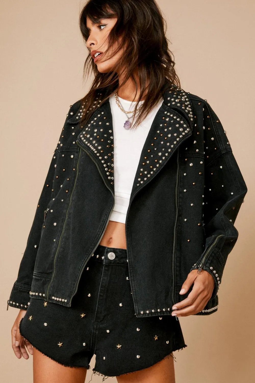 Edgy outer layers. Feel fierce in our denim jacket, made in high quality denim fabric, with a comfortable relaxed fit, and statement metallic stud detailing. Pairs well with a crop top, shorts, and boots for a look that will take you from festival weekends, to summer days out, to casual nights out.