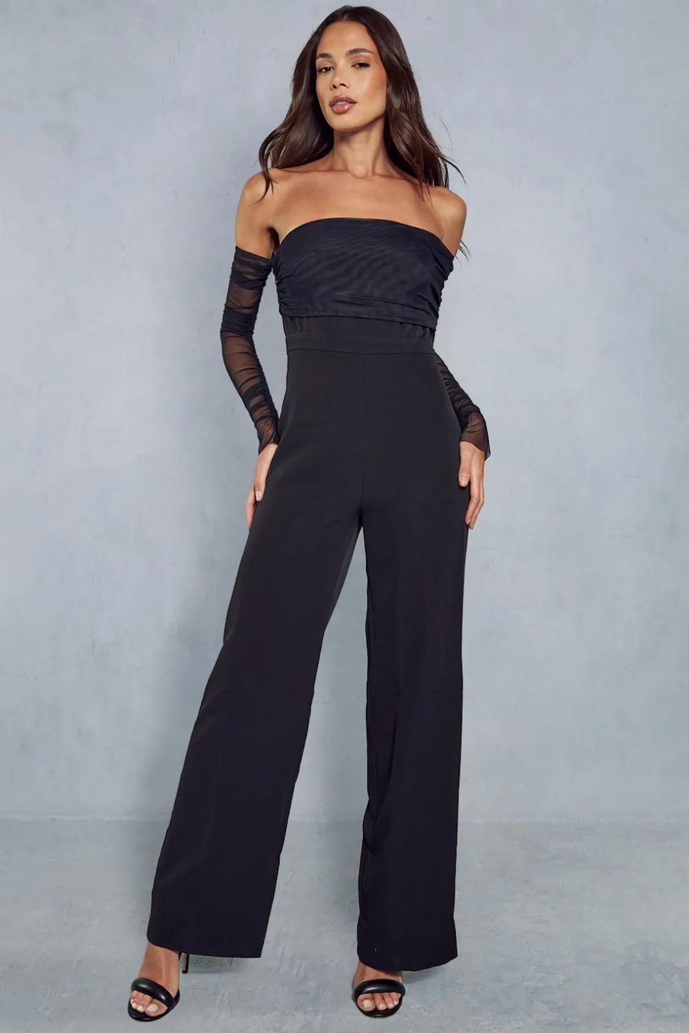 Jumpsuits|Jumpsuits^Nasty Gal Mesh Ruched Off Shoulder Bardot Wide Leg Jumpsuit |