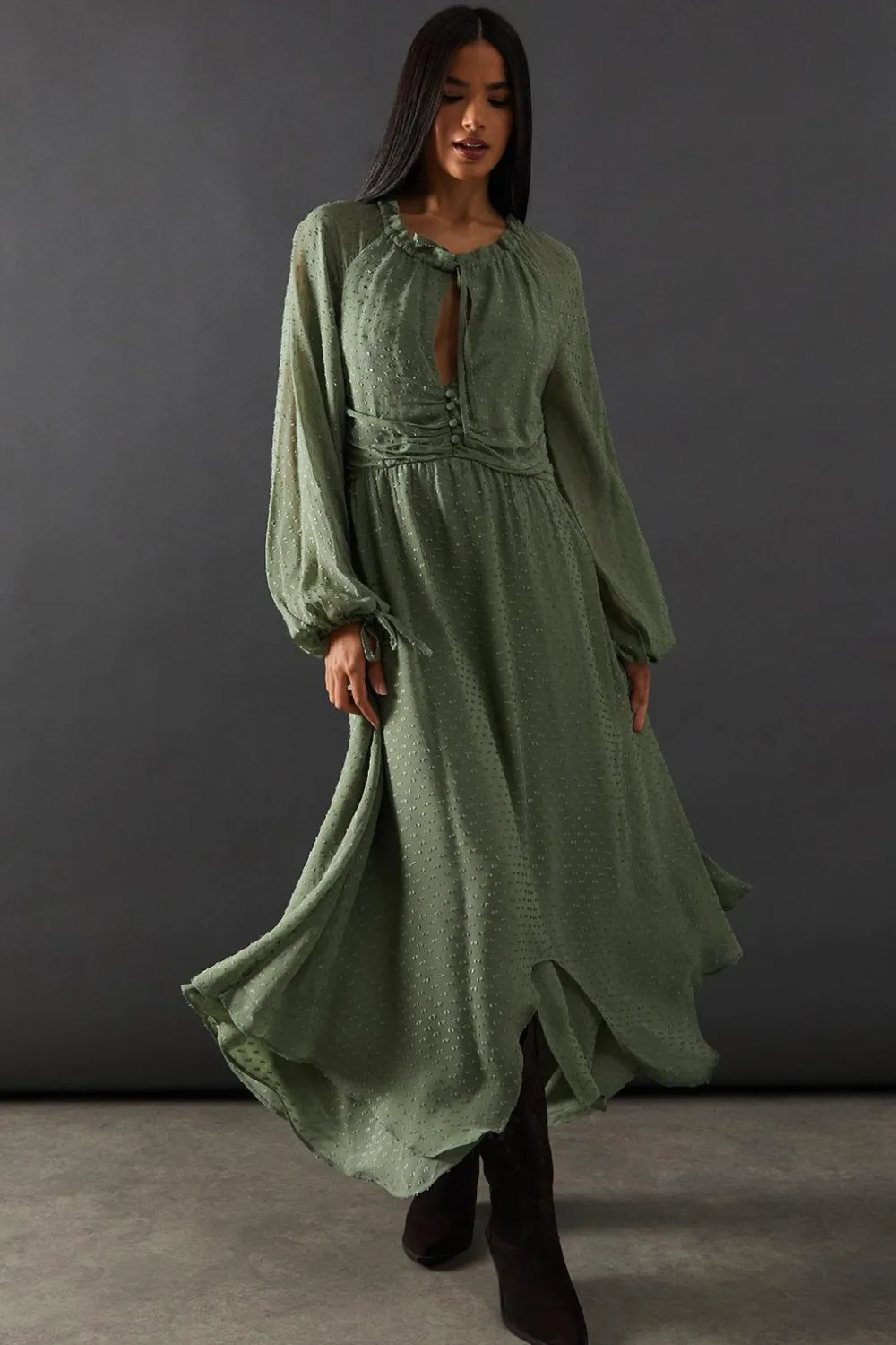 Midi Dresses|Dresses^Nasty Gal Tufted Dobby Chiffon Button Front Tie Neck Hanky Hem Midi |